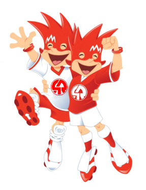 1 болельщик — немец с усами в железной каске на голове, в правой руке сосиска на вилке, в левой — стеклянный бокал с пивом.